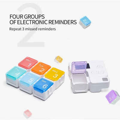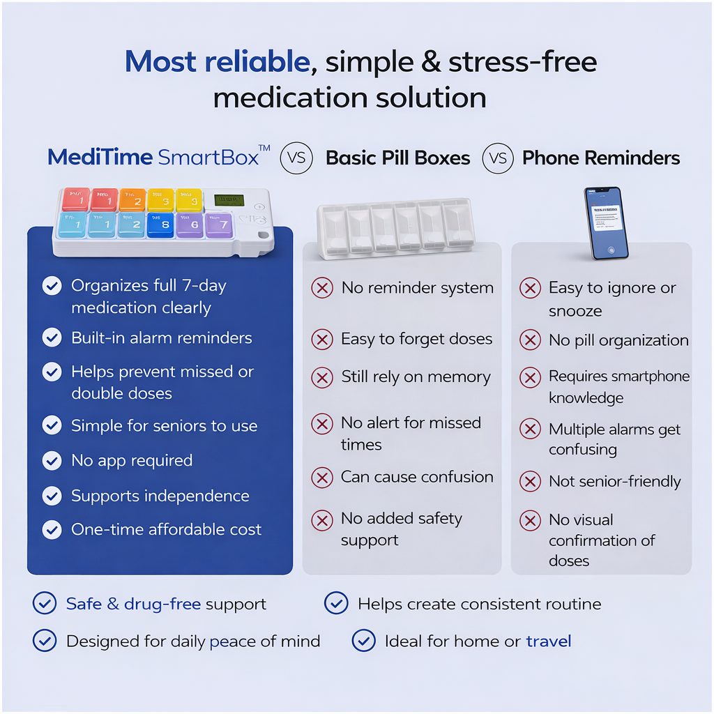MediTime SmartBox™ combines smart weekly organization and precise alarm reminders to help prevent missed or double doses — safely and confidently at home or on the go.